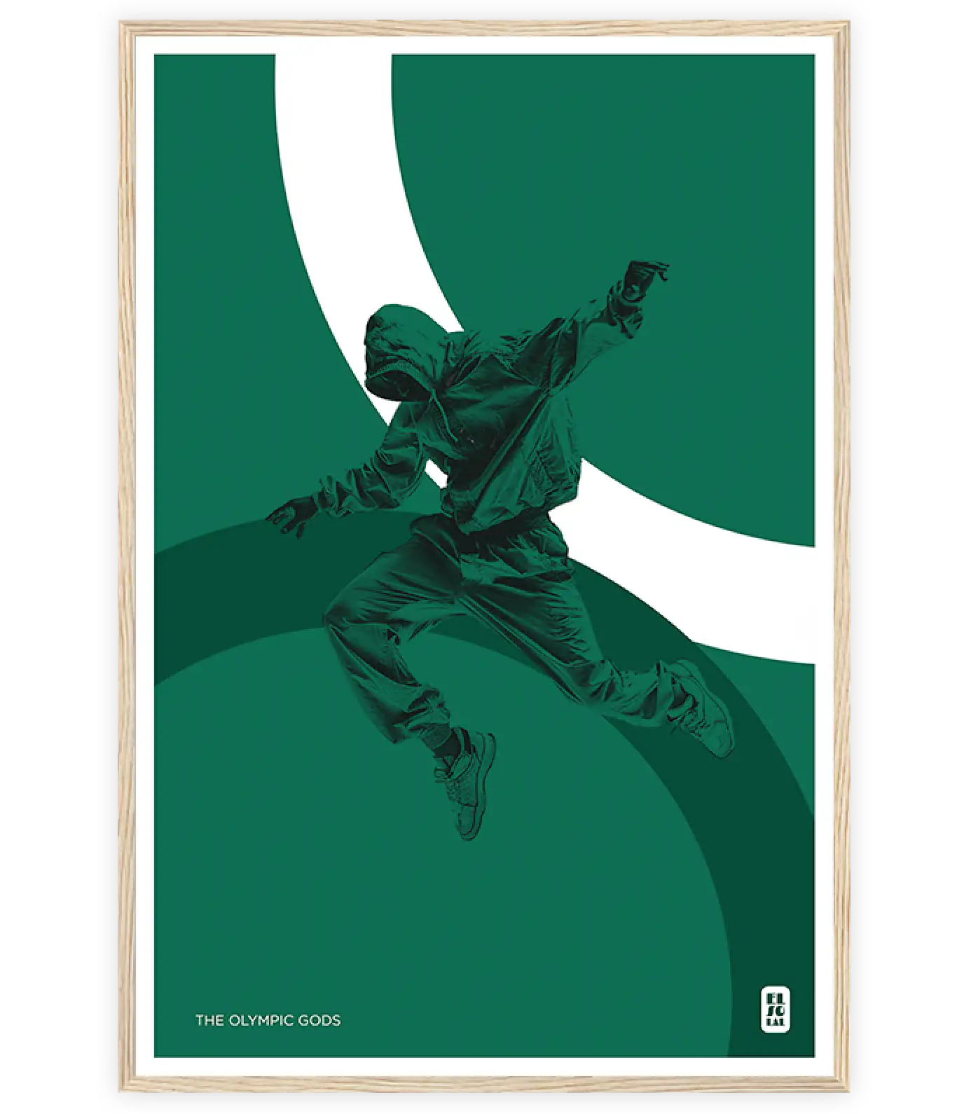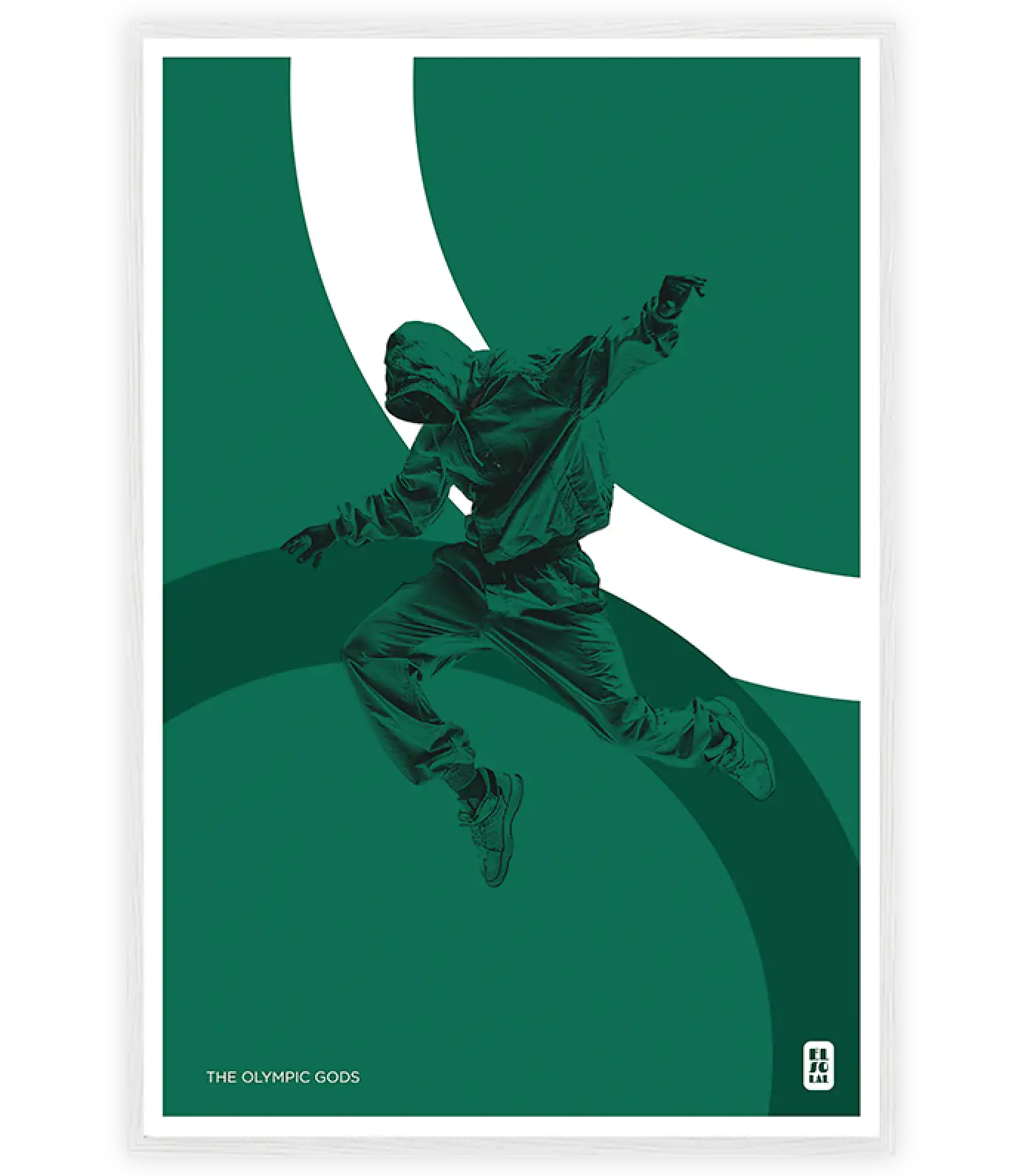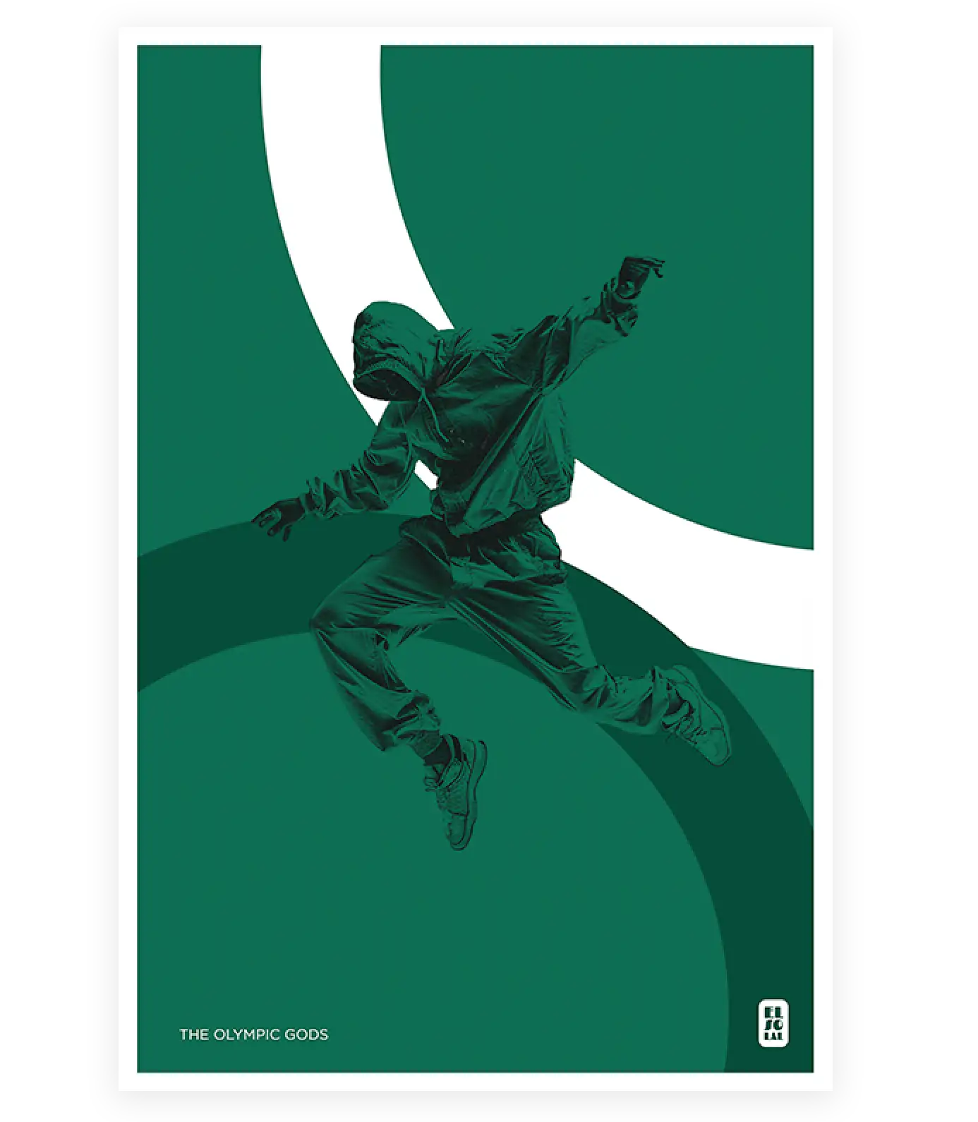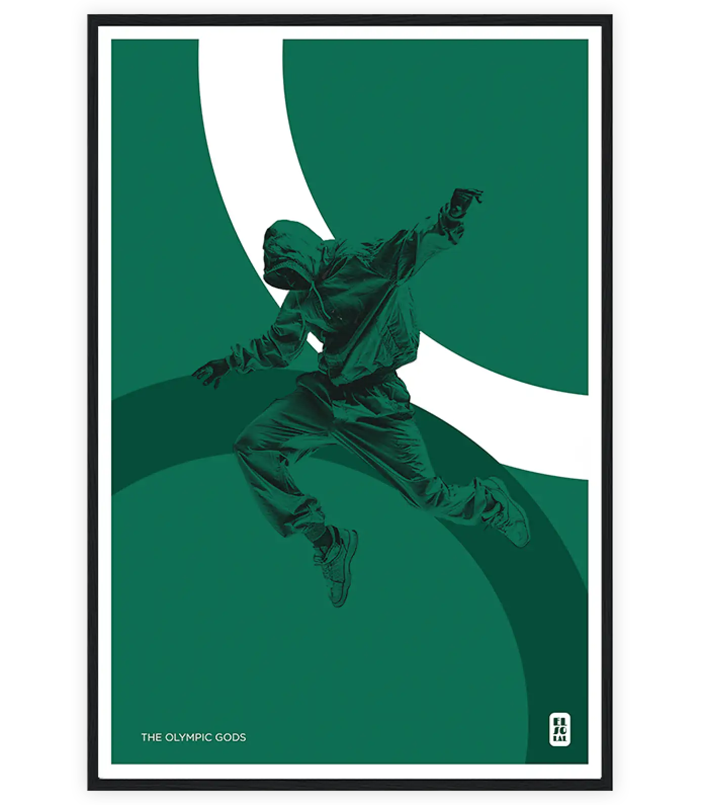 Discover the harmony between mythology and modernity with this sleek poster on the theme of the Olympic Gods. Capturing the grace and power of a hip-hop dancer in mid-air, the colored rings add a touch of dynamism and fluidity.