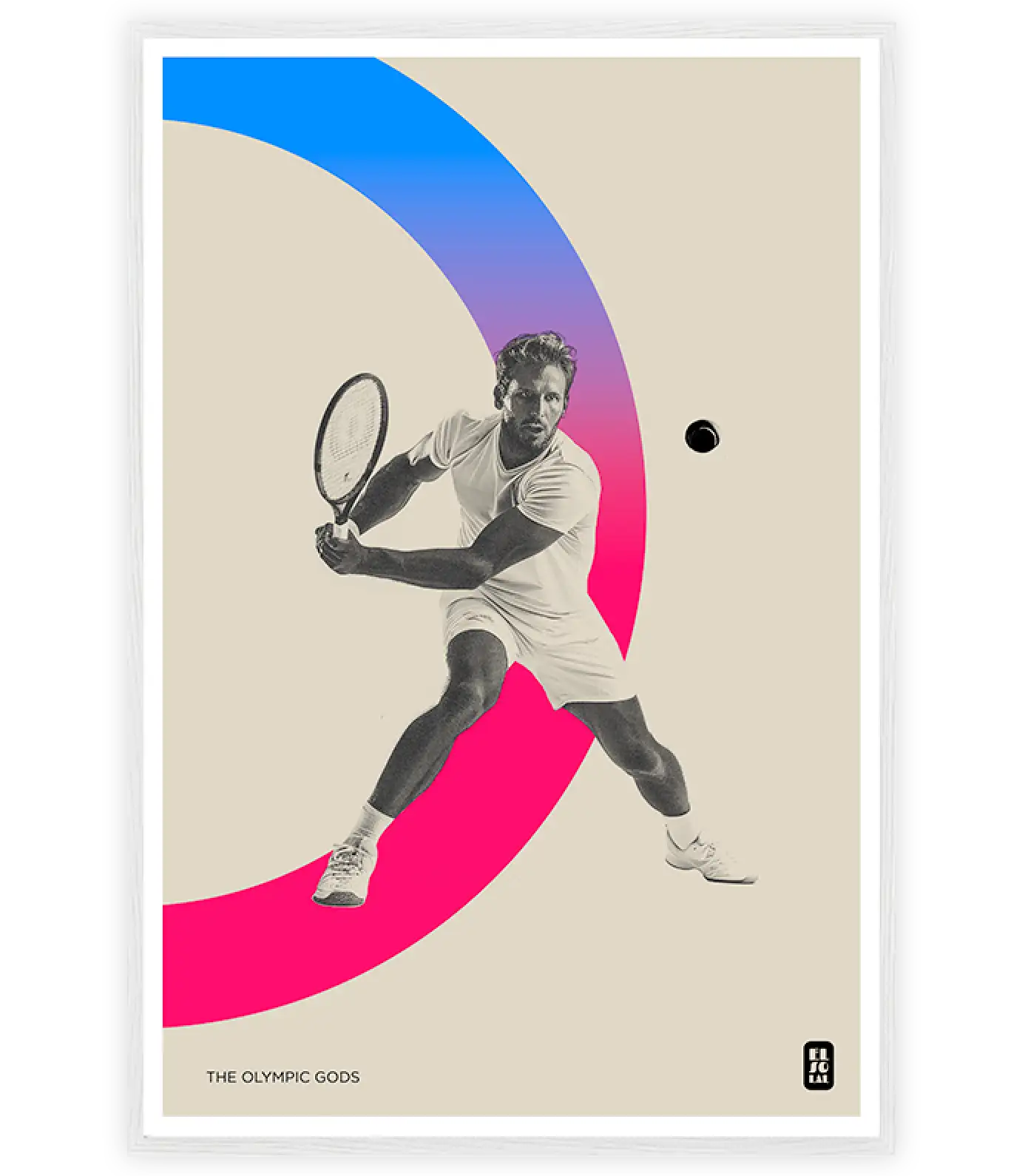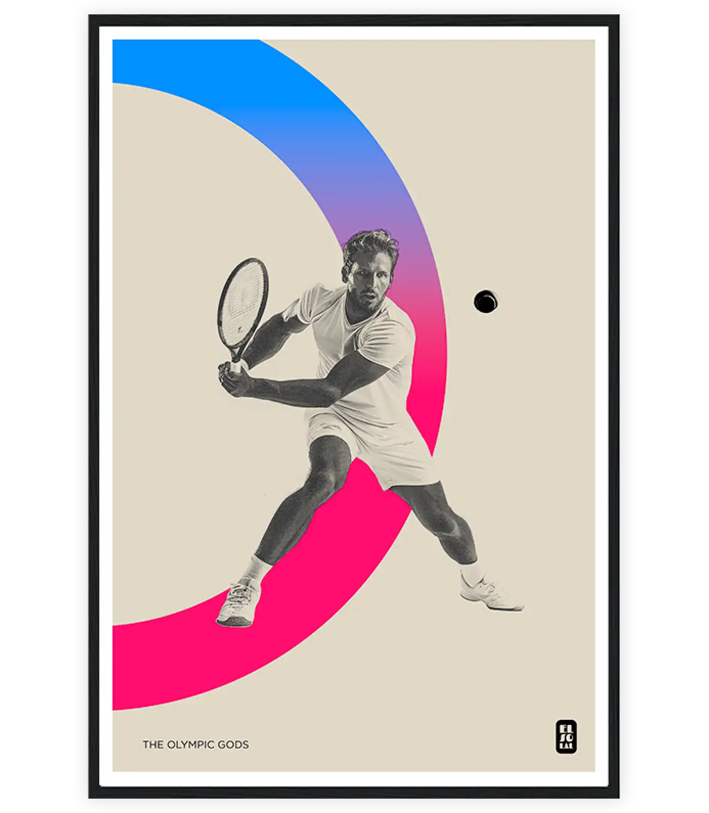 Discover the harmony between mythology and modernity with this sleek poster on the theme of the Olympic Gods. Capturing the grace and power of a tennis player in mid-motion, the colored rings add a touch of dynamism and fluidity.