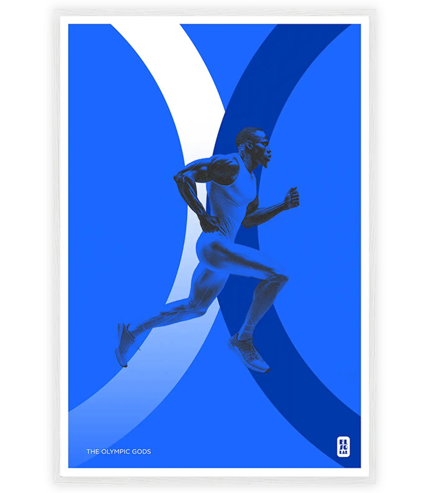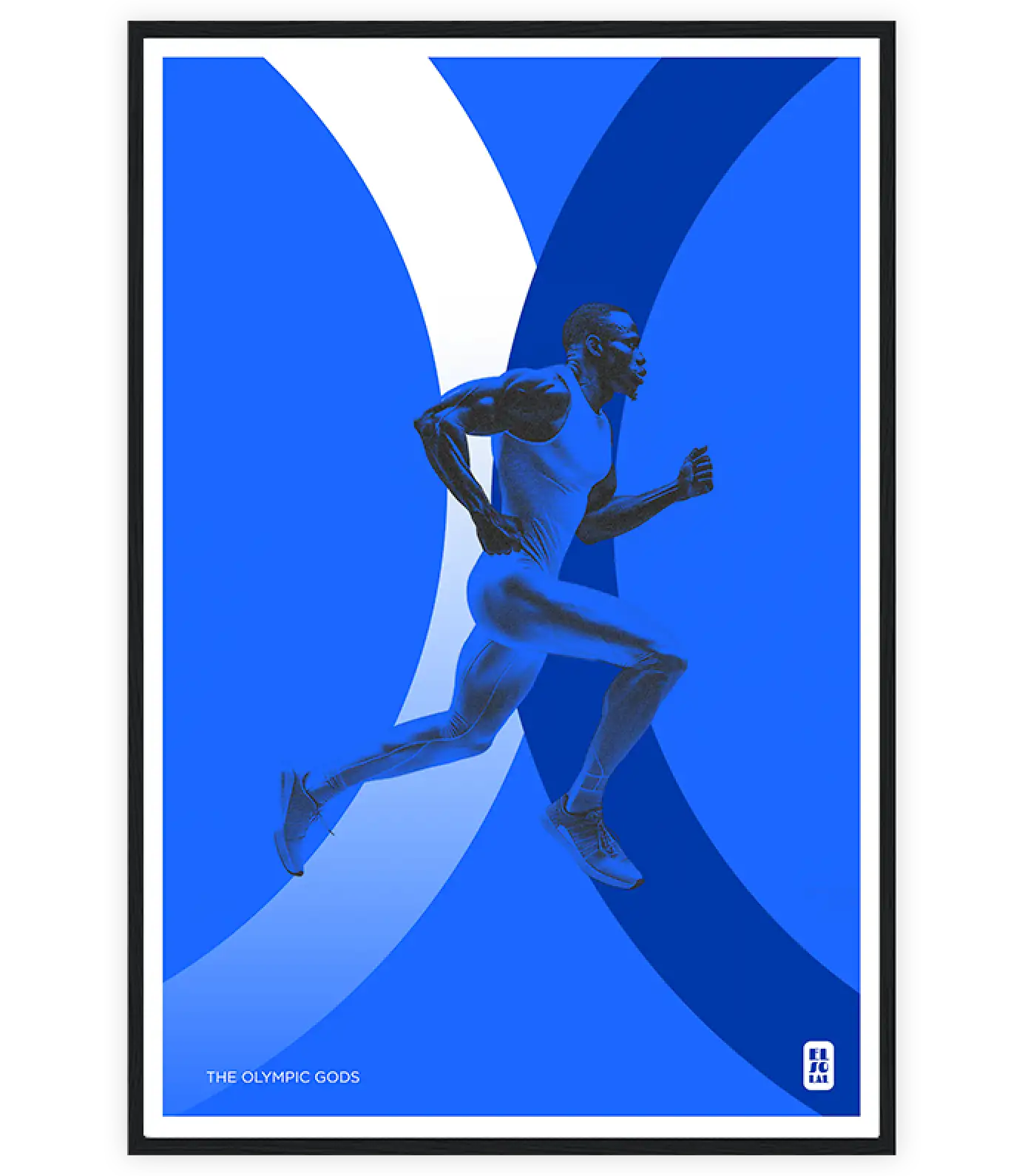 Discover the harmony between mythology and modernity with this sleek poster on the theme of the Olympic Gods. Capturing the grace and power of a track and field athlete in full stride, the colored rings add a touch of dynamism and fluidity.